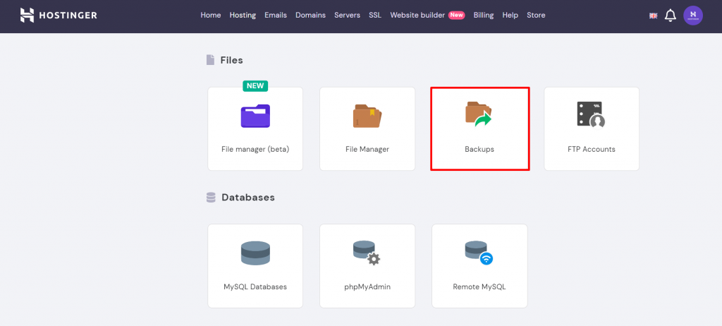 If you apply Hostinger, the process to support a site is simple. Log in to the hPanel, then navigate to Files -> Backups.